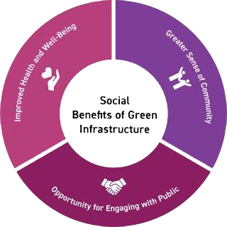 • The  social benefits created by green infrastructure include green spaces, urban tree canopies, parks, green streets, that can provide a  peaceful atmosphere for residents to enjoy. More green space and parks promote outdoor physical  activity and can be used to improve safety. Green spaces have been shown to enhance the strength of social ties between neighbors, which can lower rates of social disorder, anxiety, and  depression  within a neighborhood. Experiencing green spaces helps reduce mental fatigue or stress. In densely developed areas, adding green infrastructure provides vegetation and open space in locations that can be nature deprived. Additionally, green infrastructure with vegetation can further benefit residents by improving air quali  ty and reducing noise  pollution.